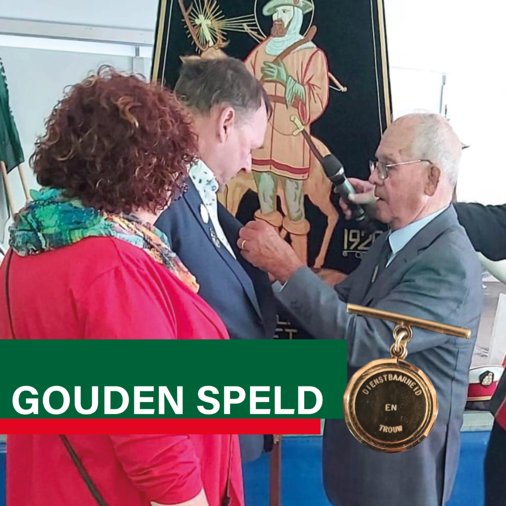 Corry heeft de Gouden Speld overgedragen aan Gerrie. Gerrie kwam al jong bij ons Gilde en heeft zich al die jaren verdienstelijk gemaakt. Zo heeft hij jaren met de dieptrom, kleine en grote trom meegelopen. Al snel kwam Gerrie bij het bestuur, in de feestcommissie en later de kermiscommissie. Hij werd onder andere verantwoordelijk voor het opbouwen van de feesttenten en alles wat daarbij komt kijken. Bij de verbouwing van het clubgebouw was hij iemand die vaak het voortouw nam en veel werk verzette.